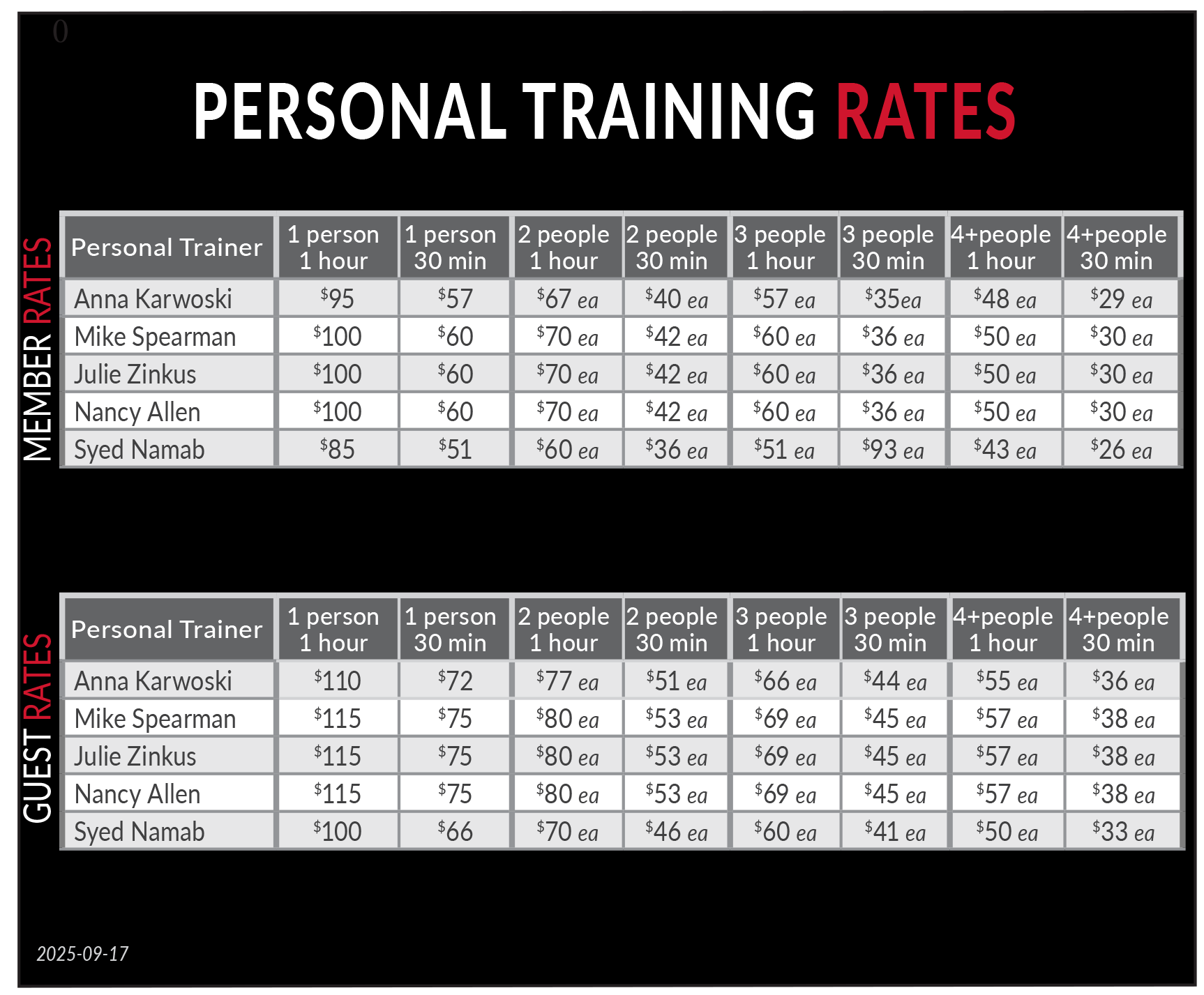 *Packages and specials are available. Please contact our Fitness Coordinator, Anna Karwoski at 630-315-5357, to learn more about packages and discounts or email [email protected]